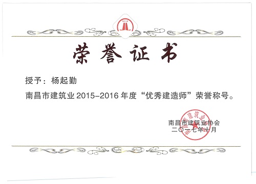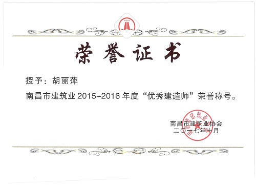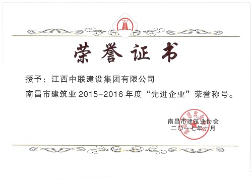 我司本次获评江西省2015-2016年度建筑业先进企业荣誉称号,是江西省建筑业协会对江西中联在建筑市场信用和综合素质的一次肯定,也是社会对中联诚信度、市场行为的充分认可,在一定程度提升了公司在建筑市场的影响力,充分展示了良好企业形象和生产管理水平。