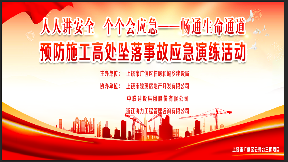 “人人讲安全,个个会应急——畅通生命通道”为进一步强化建筑工地安全管理,提高应对高空坠落等突发事件的应急处理能力,6月29日,上饶市广信区住房和城乡建设局在我司承建的上饶中骏云景台项目成功举行了一场高···
